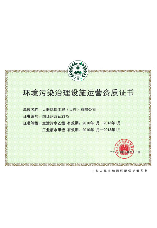 獲得環境污染治理設施運營資質(生活污水乙級 工業廢水 乙級)